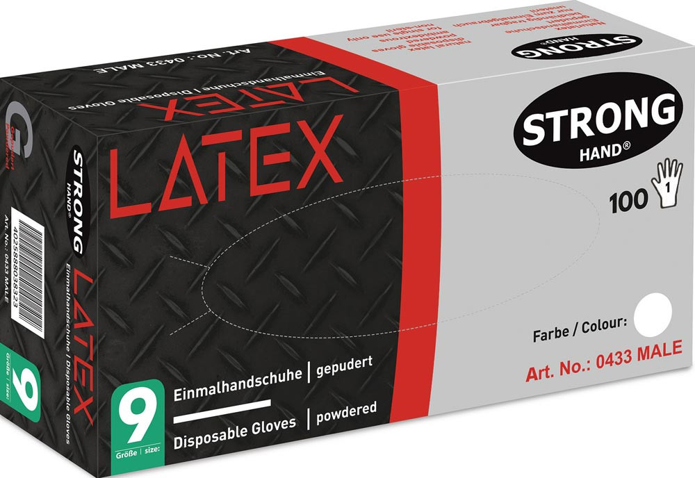Kat. I · AQL 1.5 · lebensmittelgeprüft · Material: Latex · gepudert · beidseitig tragbar · Box à 100 St. · Anwendung: lebensmittelverarbeitende Industrie, Qualitätskontrolle, Lagerarbeiten, Verpackung, Sanitärbereich, Kleinteilmontage, Elektroindustrie