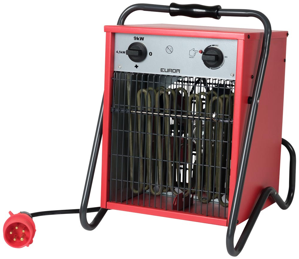 elektrische 400-V-Heizlüfterheizung · für den Einsatz in Werkstätten, Schuppen und Garagen · 9000 Watt · mit Kaltluftventilator und Thermostat · spritzwassergeschützt · robustes Metallgehäuse · Überhitzungsschutz · mit Nachkühlfunktion