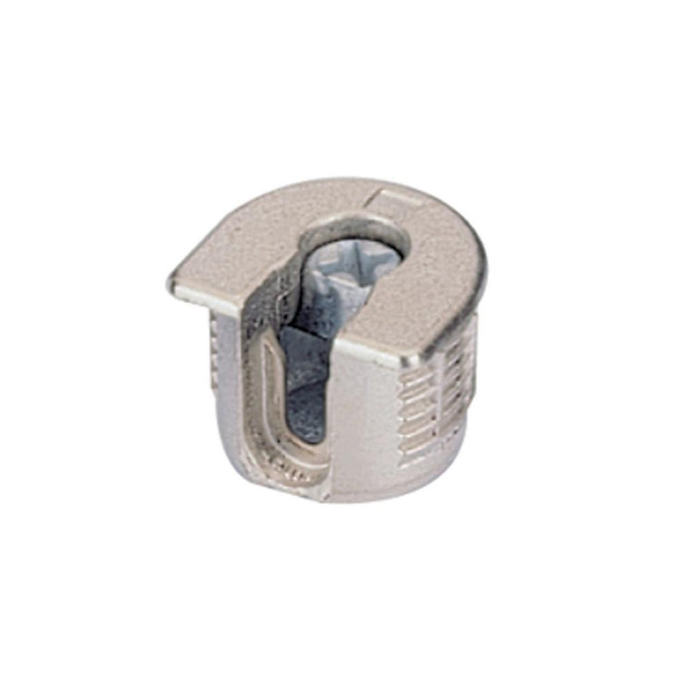 zierliche Verbindungsbeschläge für form- und kraftschlüssige Verbindungen von Fachböden mit Seitenwänden nach bewährtem Exzenter-Rastprinzip · in die angeschnittene Bohrung mit Ø 20 mm wird der Beschlag eingedrückt · der Beschlag hat einen Kugelexzenter · Zinkdruckguss / Kunststoff · einsetzbar im System 32