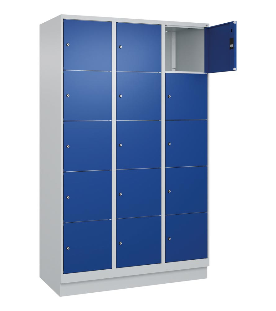 Fächerschrank, BxTxH 1200x500x1950 mm, 3x5 Fächer, Abt.B 400 mm, Sockel, Schloss, glatte Türen, RAL 7035/5010