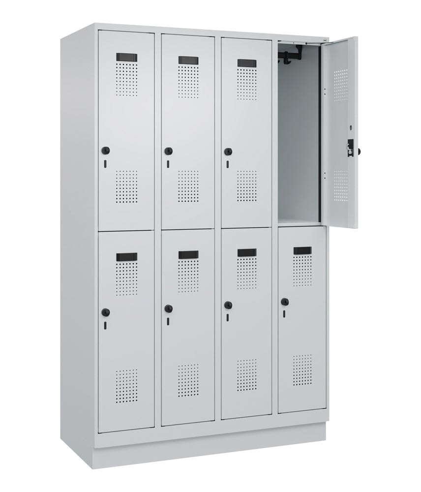 Fächerschrank, Stahl, doppelstöckig, 4x2 Fächer, Abt.B 300 mm, Sockel, Drehriegel, BxTxH 1200x500x1950 mm, RAL 7035