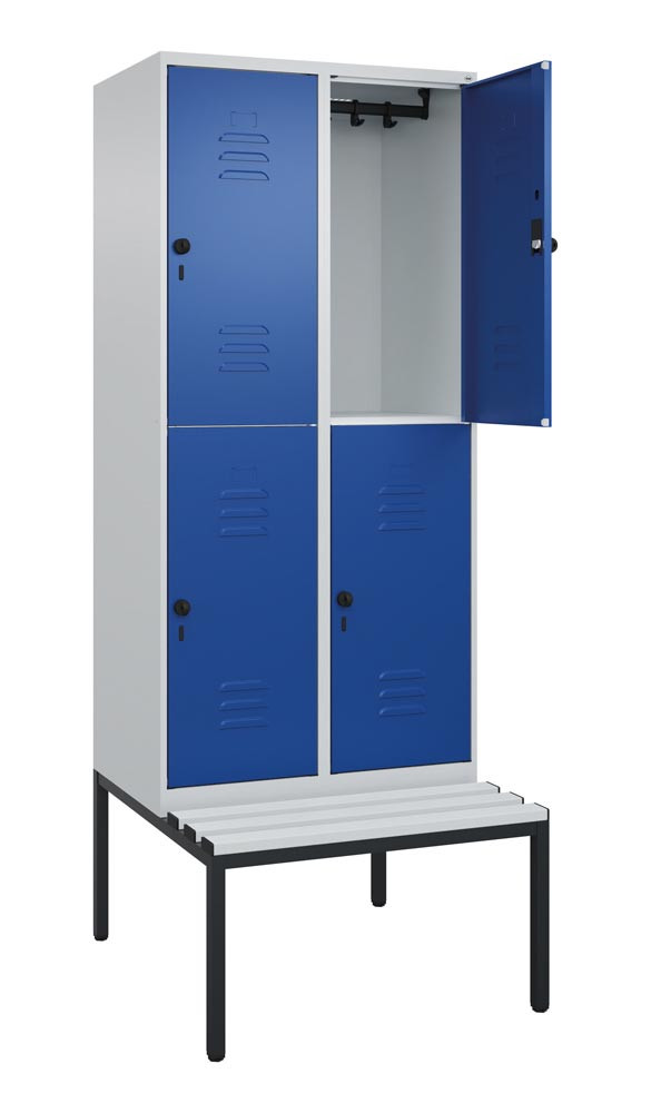 Fächerschrank, untergeb. Sitzbank, BxTxH 800x500x2120 mm, 2x2 Fächer, Abt.B 400 mm, doppelstöckig, Kunststoffleisten, Drehriegel, RAL 7035/5010