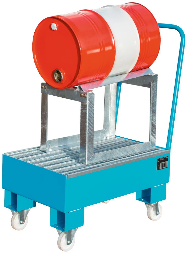 Fahrbare Auffangwanne für 1x60-l-Fass, 3 mm Stahlblech, liegend Lagern, BxTxH 940x500x1075 mm, Auffangvol. 61 l, RAL 5012 E6041853
