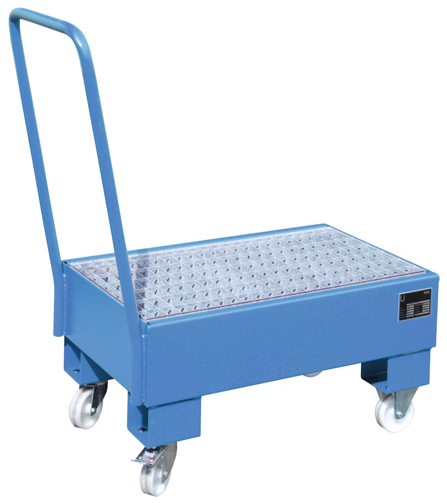 ∙ Mobile Lagerung von 60-l-Fässern ∙ Auffangwanne aus 3 mm Stahlblech inkl. verzinktem, herausnehmbaren Gitterrost ∙ Traglast 1000 kg/m2 ∙ Schiebegriff ∙ 2 Lenk- und 2 Bockrollen aus Polyamid Ø 100 mm, Bauhöhe 125 mm, davon 1 Lenkrolle mit Feststeller