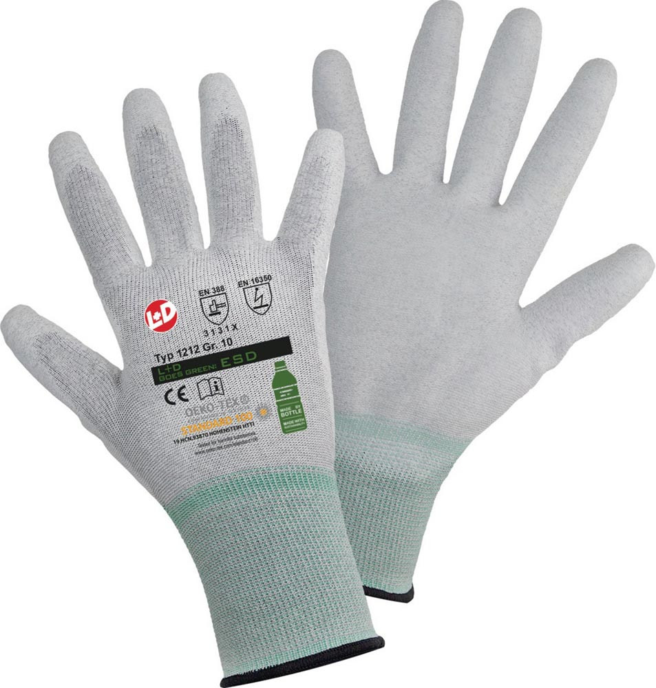 nach EN ISO 21420:2020 ESD, EN 388:2018, EN 16350:2014 · Kat. II · Material: aus einer Kombination von RPET (90% recyceltem Polyethylenterephthalat) und Carbonfaser · mit weißer PU-Beschichtung in der Innenhand · atmungsaktiver Handrücken für besonderen Tragekomfort · perfekte Passform · hervorragende antistatische Ausführung und Schutz vor mechanischen Einwirkungen · hervorragender Tastsinn und ein besonderes Feingefühl · Anwendung: für Arbeiten, bei denen die Teile vor elektrischer Aufladung geschützt werden sollte z. B. Elektroindustrie, Mikroelektronik, Automobilindustrie und auch in der IT-Branche