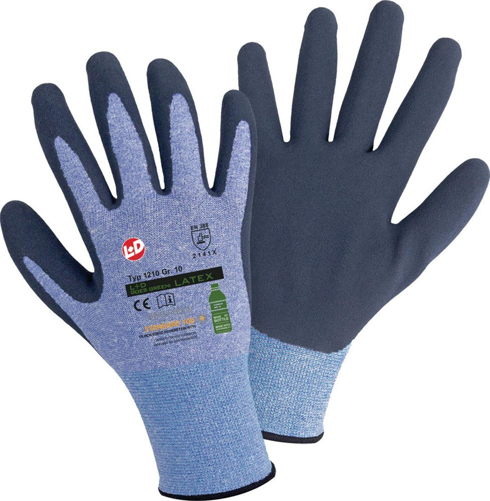nach EN ISO 21420:2020, EN 388:2016+A1:2018 · Kat. II · Material: Mix von RPET (55% recyceltem Polyethylenterephthalat) / Polyester und Elasthan · hellblau meliert, mit dunkelblauer, gesandeter Latex-Beschichtung in der Innenhand · angenehm weiches und geschmeidiges Tragegefühl · optimale Griffsicherheit und Rutschfestigkeit · sehr gute Fingerfertigkeit und perfekte Passform · Anwendung: für leichte bis mittlere Arbeiten aller Art z. B. Handwerksbereich, Montagearbeiten, Sortierarbeiten, Verpackungsindustrie, Transport, Garten- und Landschaftsbau