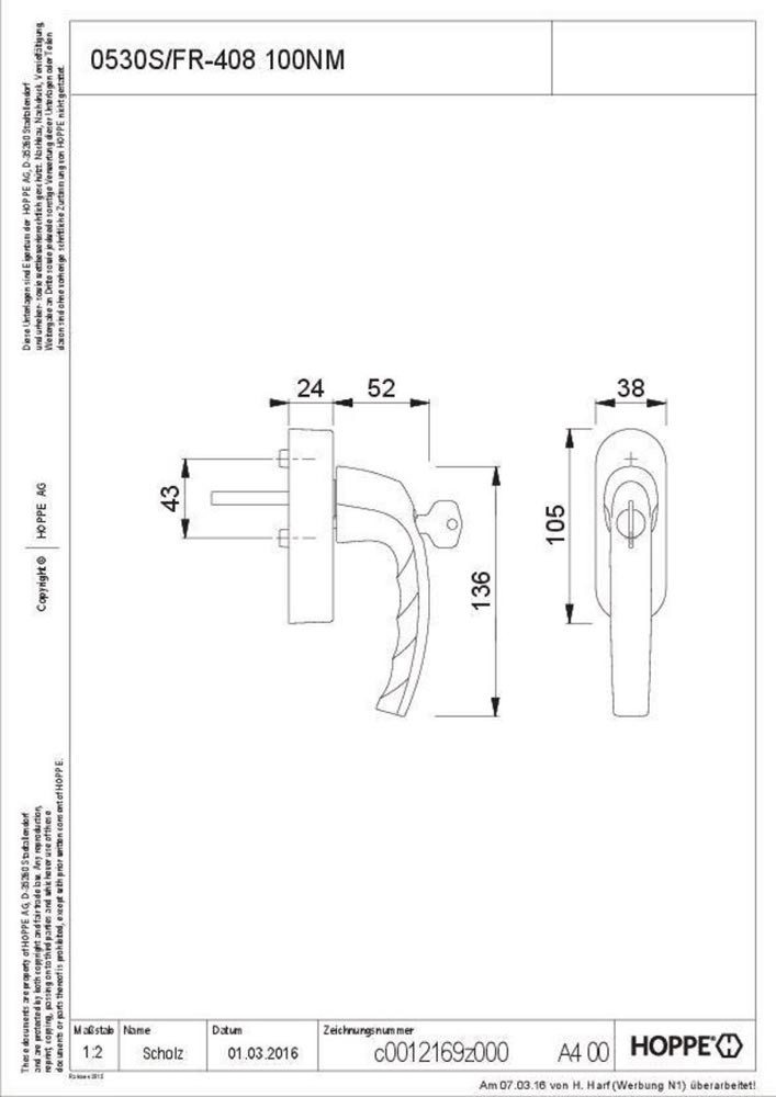 erfüllt die Anforderungen nach DIN EN 13126-3 (Schutzwirkung Klasse 2) und DIN EN 1627-1630 RC1-6 · Schließung: Druckzylinder, Wendeschlüssel · Rastung: 90° · Abdeckung: Voll-Abdeckkappe · Unterkonstruktion: Kunststoff, Stütznocken · Stift: HOPPE-Vollstift, 10 mm Längenvariabilität (32-42mm), stufenlose Anpassung durch integrierte Druckfeder im Griffhals · Befestigung: verdeckt, Gewindeschrauben M5 · Temperaturbereich: Lagerung -20 °C bis +65 °C, Betrieb +5 °C bis +40 °C · Relative Luftfeuchtigkeit: max. 80 %, nicht kondensierend · Funk-Protokoll: EnOcean EEP F6-10-00 · Funk-Frequenz: 868 MHz · Übertragungsrate: 120 kbps +/-5 % · Übermittelte Informationen: Griffstellung (geöffnet/gekippt/geschlossen) · Sendeleistung: max. 10mW EIRP · Funk-Reichweite: gemäß EnOcean-Spezifikation max. 30 m, abhängig von der Gebäudebeschaffenheit · Stromversorgung: batterielos, über Energy Harvesting