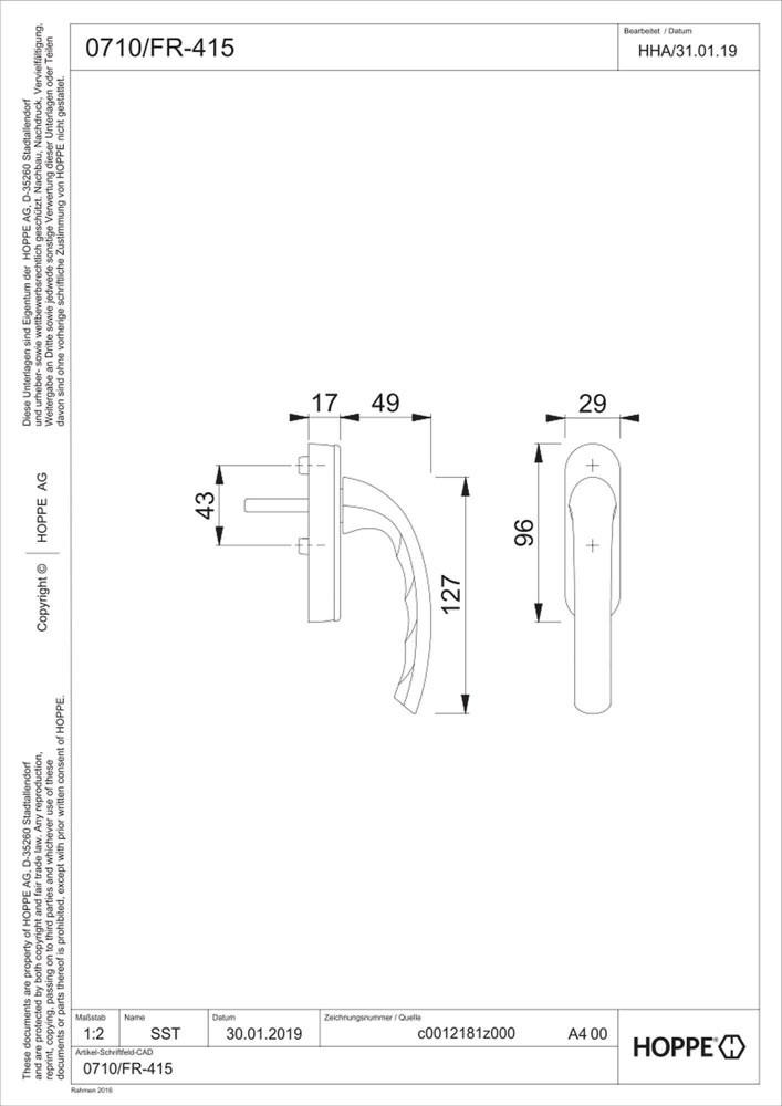 Rastung: 90° · Abdeckung: Teil-Abdeckkappe · Unterkonstruktion: Kunststoff, Stütznocken · Stift: HOPPE-Vollstift, 10 mm Längenvariabilität (32-42mm), stufenlose Anpassung durch integrierte Druckfeder im Griffhals · Befestigung: verdeckt, Gewindeschrauben M5 · Temperaturbereich: Lagerung -20 °C bis +65 °C, Betrieb +5 °C bis +40 °C · Relative Luftfeuchtigkeit: max. 80 %, nicht kondensierend · Funk-Protokoll: EnOcean EEP F6-10-00 · Funk-Frequenz: 868 MHz · Übertragungsrate: 120 kbps +/-5 % · Übermittelte Informationen: Griffstellung (geöffnet/geschlossen) · Sendeleistung: max. 10mW EIRP · Funk-Reichweite: gemäß EnOcean-Spezifikation max. 30 m, abhängig von der Gebäudebeschaffenheit · Stromversorgung: batterielos, über Energy Harvesting