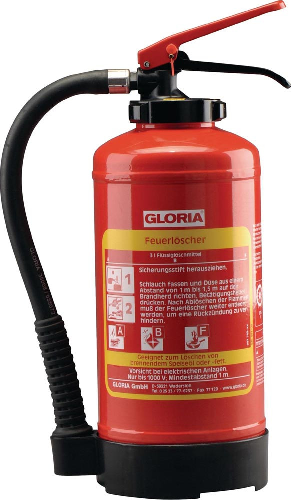 Brandklassen A, F · Flüssiglöschmittel mit Spezialeignung für Speiseöle und -fette · bis zu 75 l brennendes Speiseöl oder -fett wird zuverlässig gelöscht · Treibmittelflasche innenliegend (bei 6 l-Löscher) · Temperaturfunktionsbereich: -5 ºC bis +60 ºC · 3 l-Löscher / 6 l-Löscher: Aufladefeuerlöscher · prüf- und nachfüllbar · mit Wandhalter
