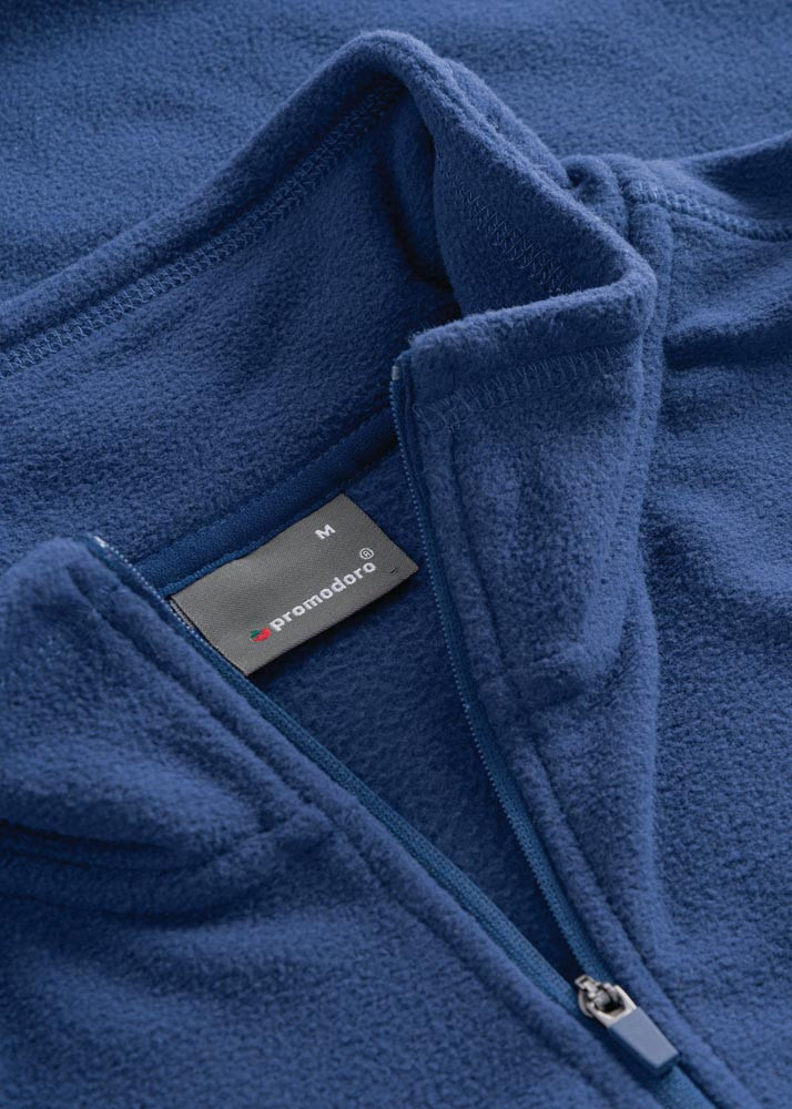 100% recycled Polyester, ca. 250 g/m² · Stehkragen mit Reißverschluss · schmaler elastischer Abschluss an Ärmeln und Saum · versetzte Schulter und Seitennaht · Anti-Pilling-Ausrüstung · recycled aus Plastikflaschen
