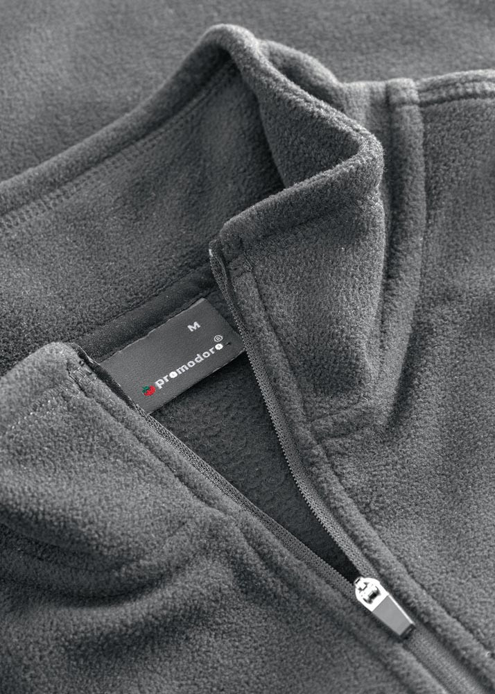 100% recycled Polyester, ca. 250 g/m² · Stehkragen mit Reißverschluss · schmaler elastischer Abschluss an Ärmeln und Saum · versetzte Schulter und Seitennaht · Anti-Pilling-Ausrüstung · recycled aus Plastikflaschen