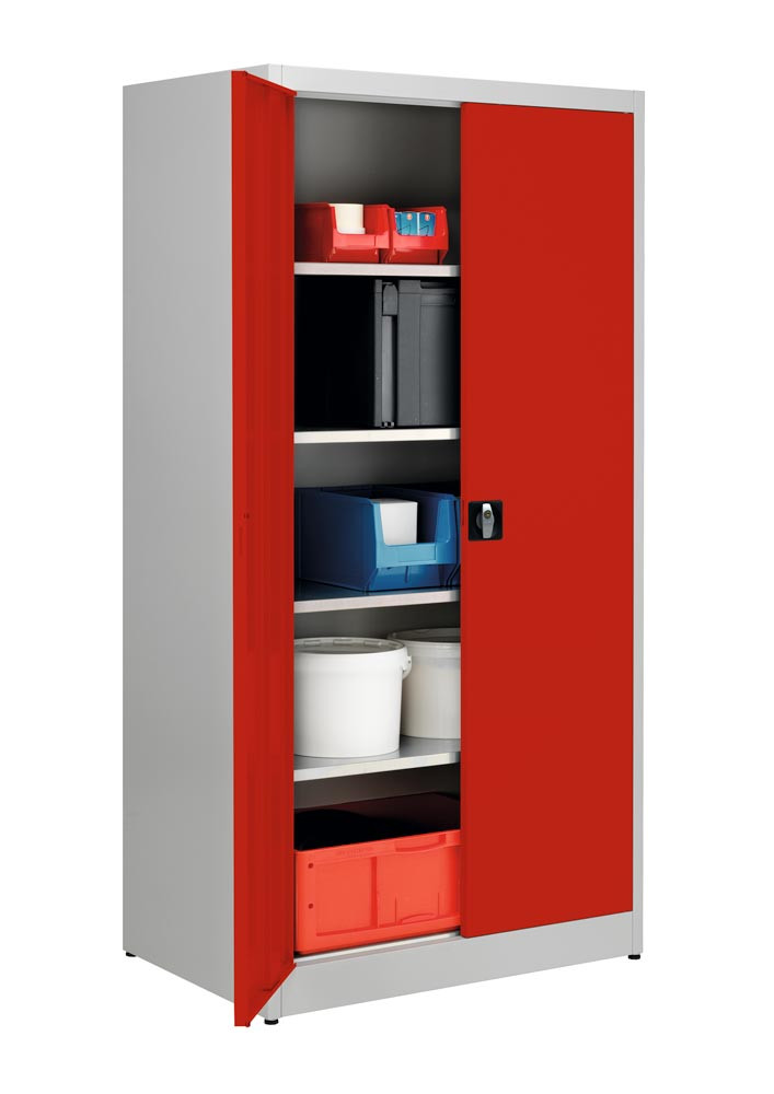 Flügeltürenschrank, 4 verz. Fachböden, BxTxH 950x600x1965 mm, RAL7035 lichtgrau/RAL3000 feuerrot