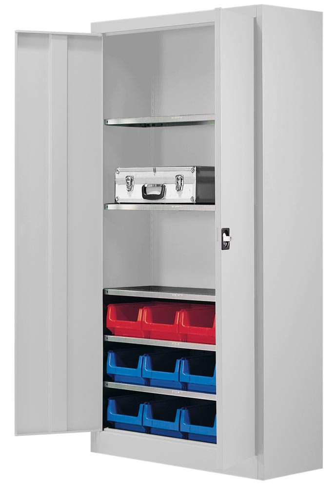Flügeltürenschrank, BxTxH 950x420x1950 mm, RAL 7035 lichtgrau, Fachlast 80 kg, mit Kästen: 4xGr. 3z rot, 8xGr. 3z blau