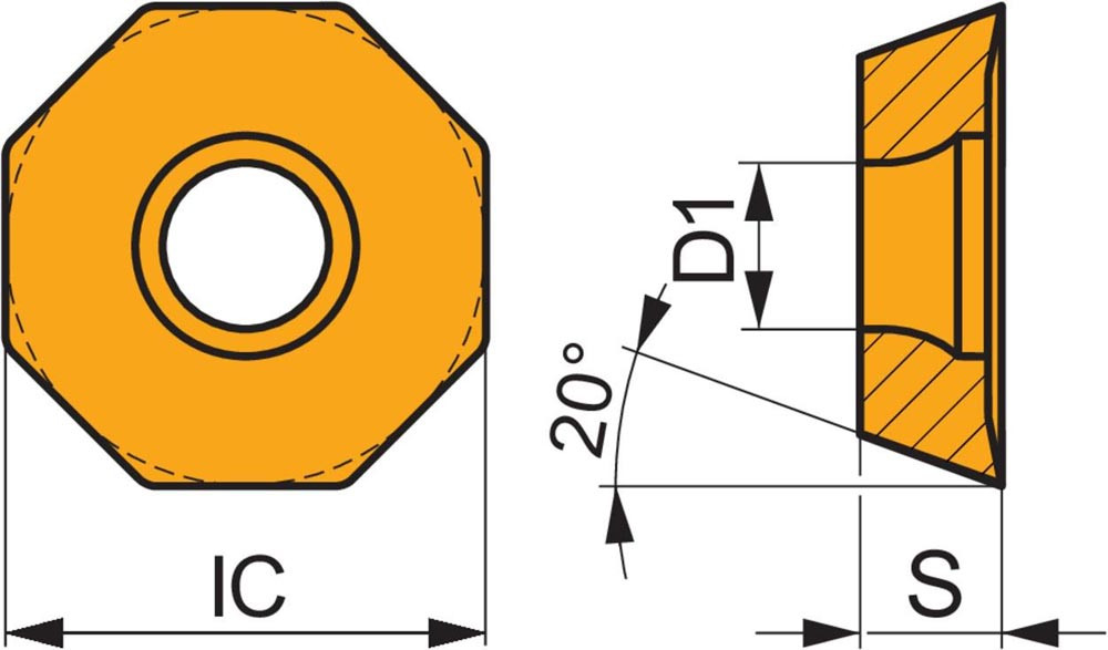 Einseitige Fräswendeschneidplatte OEHT 0604 mit Spanbrecher · Oktagonal für eine maximale Schnitttiefe von 3.3mm · mit eine Indexierungsgenauigkeit gemäß ISO-Toleranzklasse-H und M Geometrie mit verrundeter und facettierter Schneidkante · M6330 PVD Beschichtung WC-Co Substrat in den ISO-Gruppen P20 -P35 und M20 -M35 zum bearbeiten von Stahl und nichtrostenden Stahl mit Planfräsern SOE06Z