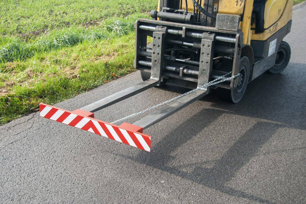 · Stabile Stahlblechkonstruktion · Mit Einfahrtaschen · Sicherung gegen Abrutschen · Standardmäßig für max. Zinkenlänge 1200 mm (bei längeren ZInken bitte deutlich vermerken)· Lackierung RAL 3000 feuerrot · Rot-weiße Warnmarkierung