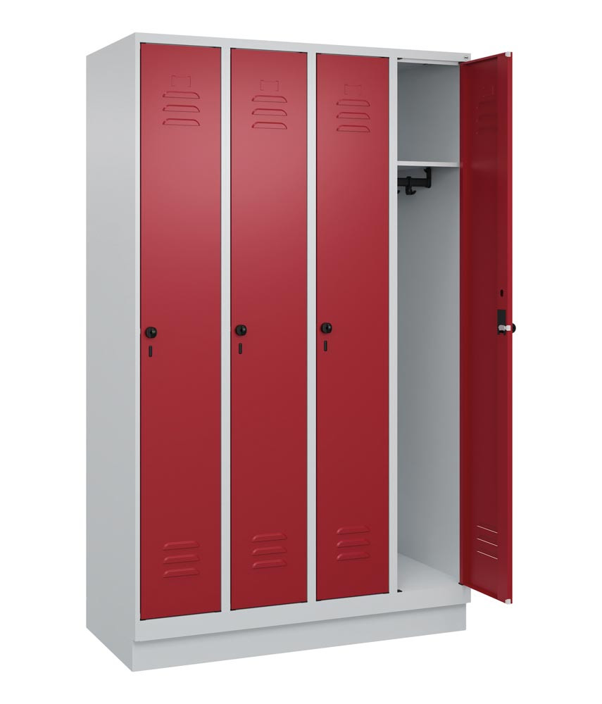 Garderobenschrank, BxTxH 1200x500x1950 mm, 4 Abteile, B 300 mm, Sockel, Drehriegel, Farbwahl