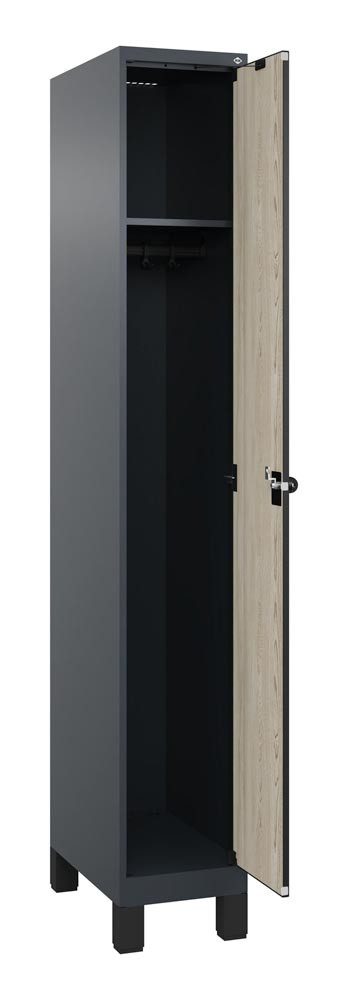 Garderobenschrank, Füße, 1 Abt., Abt.B 300 mm, BxTxH 300x500x1950 mm, HPL-Dekorfront, RAL 7016/Dekor Sen-Esche