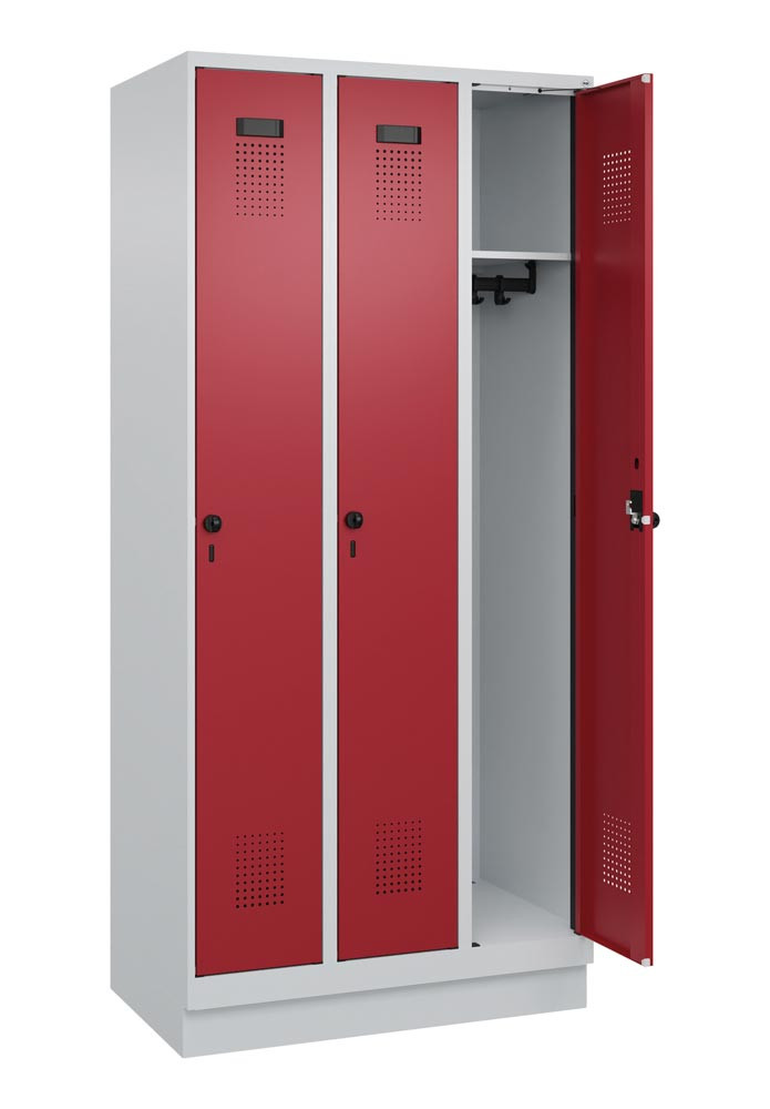 Garderobenschrank, Sockel, 3 Abteile, Abt.B 300 mm, Drehriegel, BxTxH 900x500x1950 mm, Farbwahl