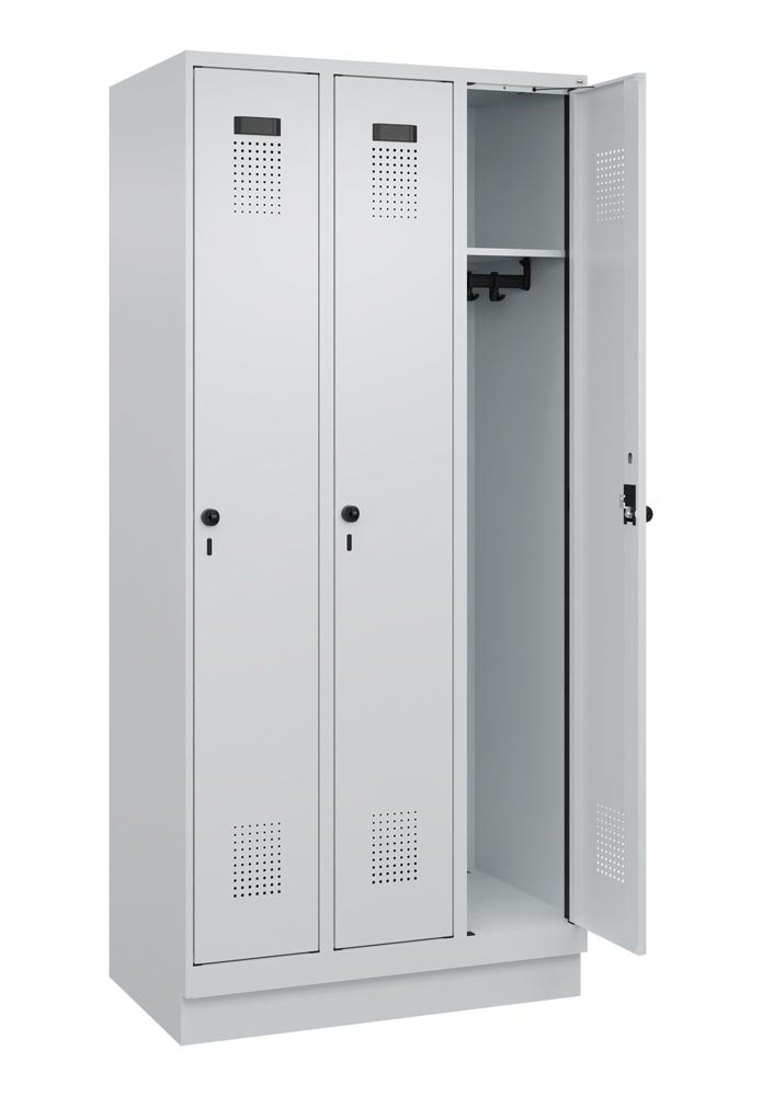 Garderobenschrank, Sockel, 3 Abteile, Abt.B 300 mm, Drehriegel, BxTxH 900x500x1950 mm, RAL 7035