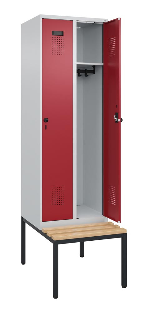 Garderobenschrank, untergeb. Sitzbank, Buche-Sitzleisten, 2 Abteile, Abt.B 300 mm, Drehriegel, BxTxH 600x500x2120 mm, Farbwahl