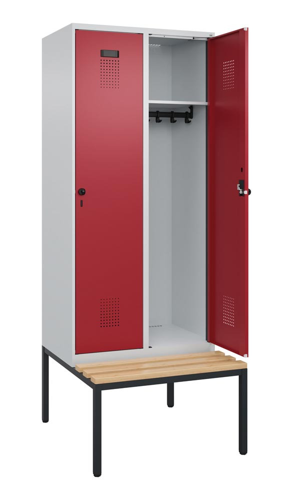 Garderobenschrank, untergeb. Sitzbank, Buche-Sitzleisten, 2 Abteile, Abt.B 400 mm, Drehriegel, BxTxH 800x500x2120 mm, Farbwahl