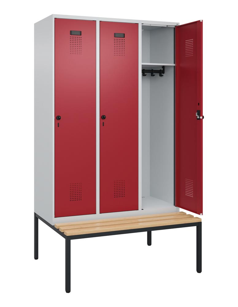 Garderobenschrank, untergeb. Sitzbank, Buche-Sitzleisten, 3 Abteile, Abt.B 400 mm, Drehriegel, BxTxH 1200x500x2120 mm, Farbwahl