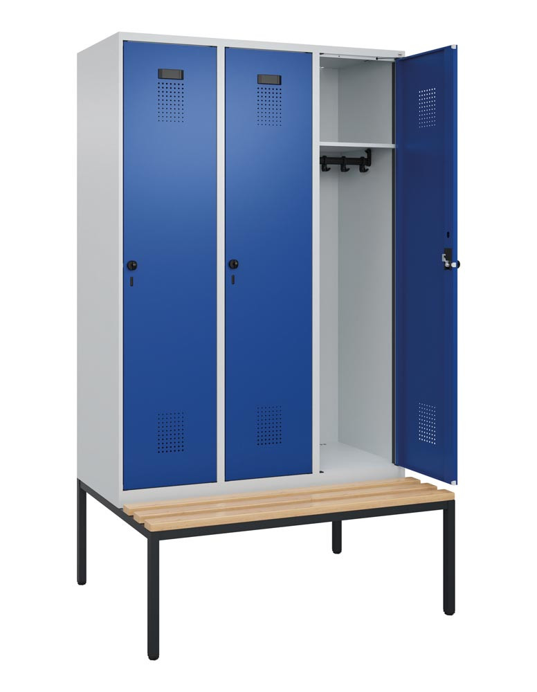 Garderobenschrank, untergeb. Sitzbank, Buche-Sitzleisten, 1 Abteil, Abt.B 300 mm, Drehriegel, BxTxH 300x500x2120 mm, RAL 7035/5010 E6476592