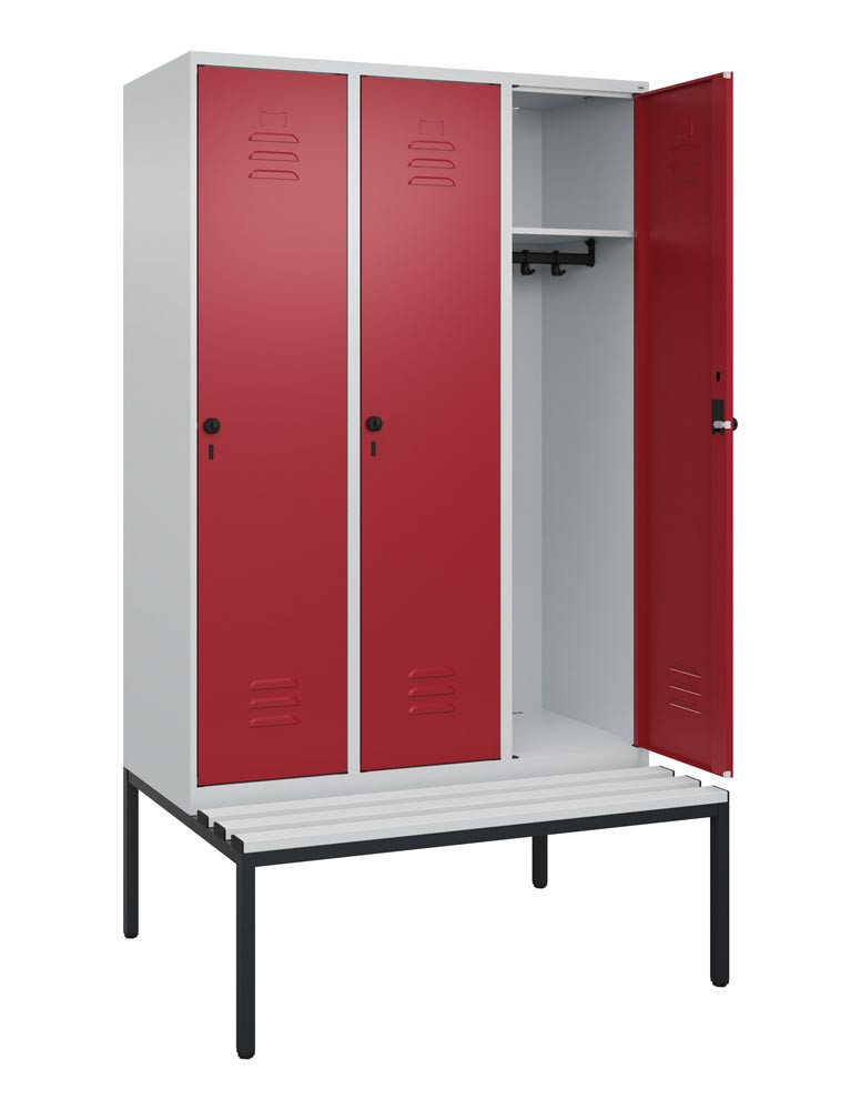 Garderobenschrank, untergeb. Sitzbank, BxTxH 1200x500x2120 mm, 3 Abteile, Abt.B 400 mm, Kunststoffleisten, Drehriegel, Farbwahl