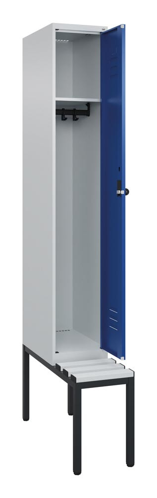 Garderobenschrank, untergeb. Sitzbank, BxTxH 300x500x2120 mm, 1 Abteil, Abt.B 300 mm, Kunststoffleisten, Drehriegel, RAL 7035/5010 E6476191