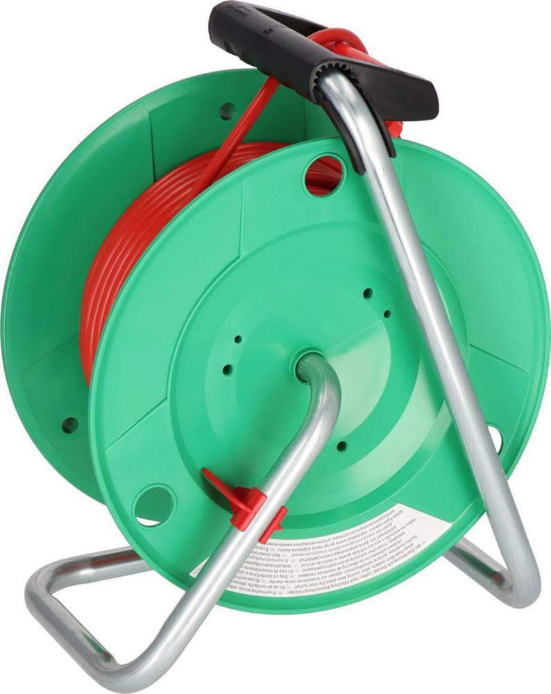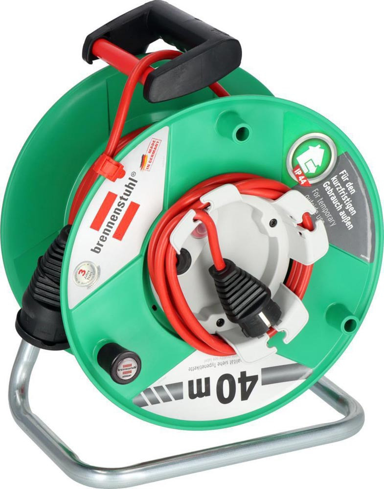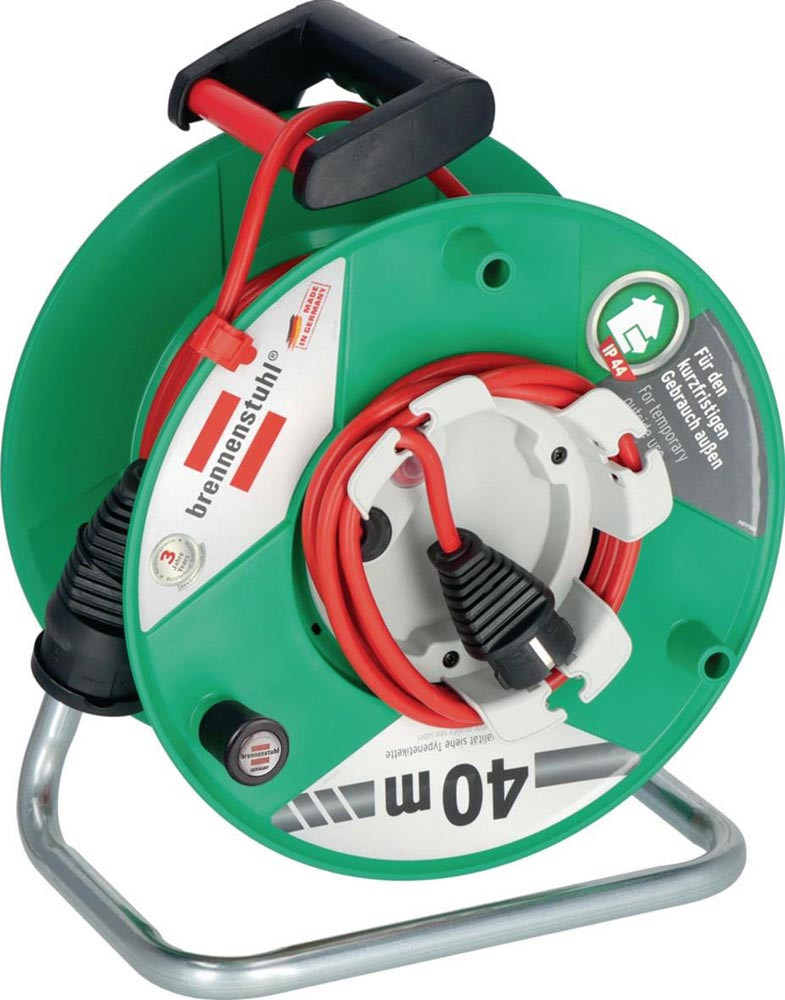Trommelkörper aus Spezialkunststoff auf verzinketem Tragegestell · Kabelfarbe: rot · Schutzart IP 44 · Kabelbezeichnung: H05VV-F3G1,5 · ergonomischer Handgriff · Überhitzungsschutz, Kontrollleuchte bei Überhitzung und Überlastung · für kurzzeitige Verwendung im Freien