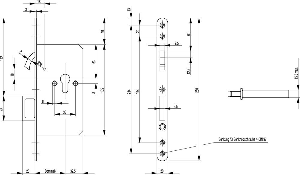 Einsteck-Gegenkasten für Schiebetürschloss 0353 · Springgriff mit Auslöseknopf · Aussparung für Zirkelriegel · verzinkter, allseitig geschlossener Kasten
