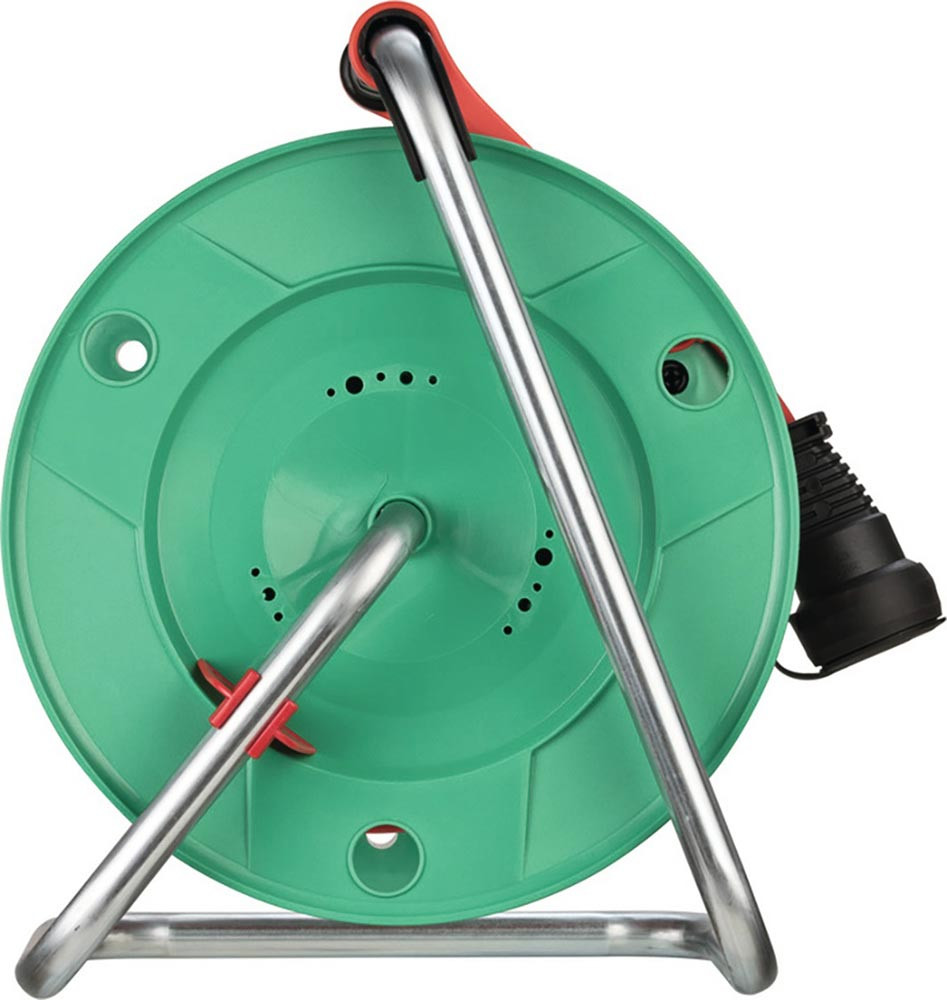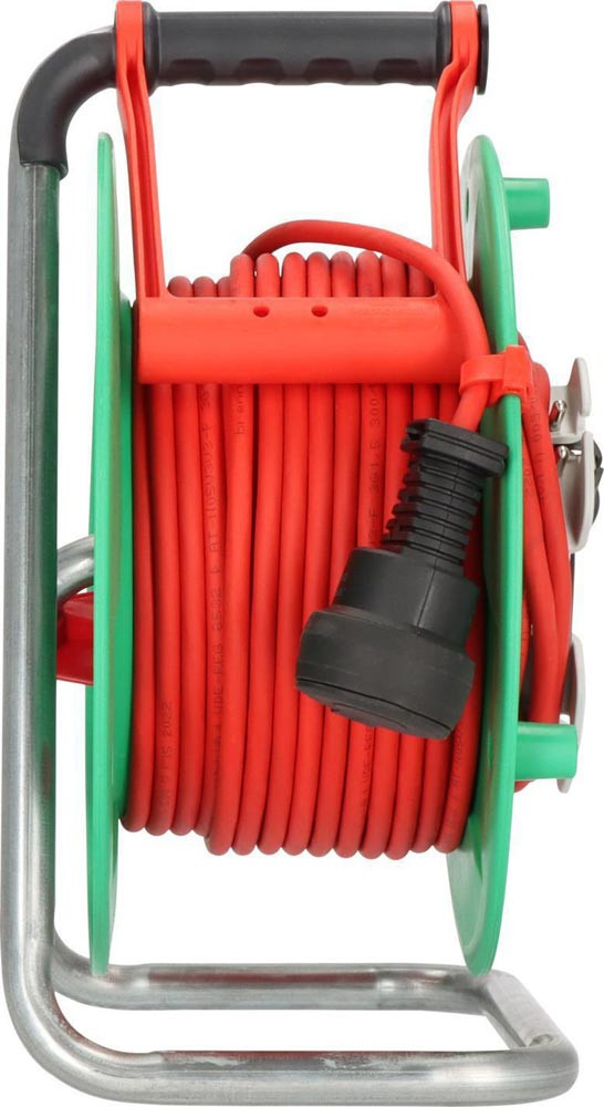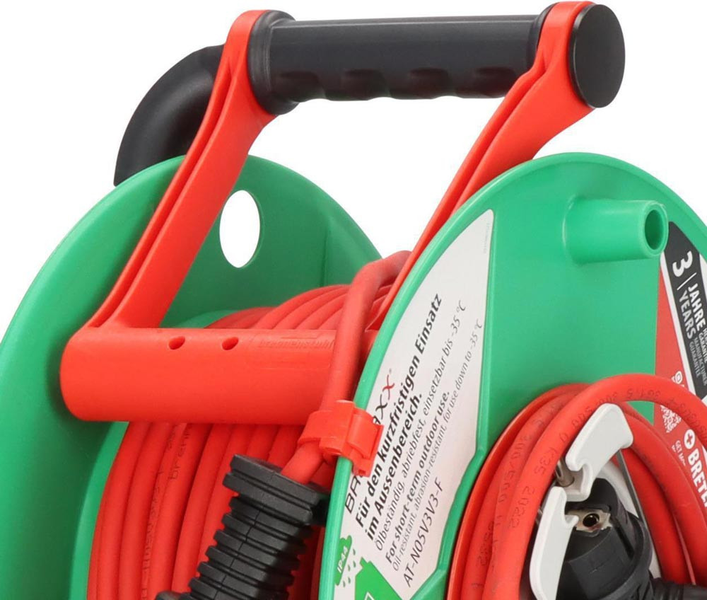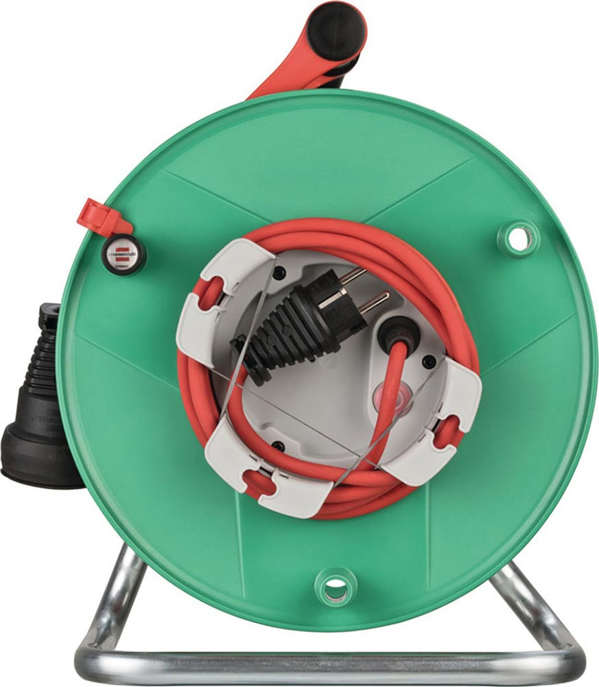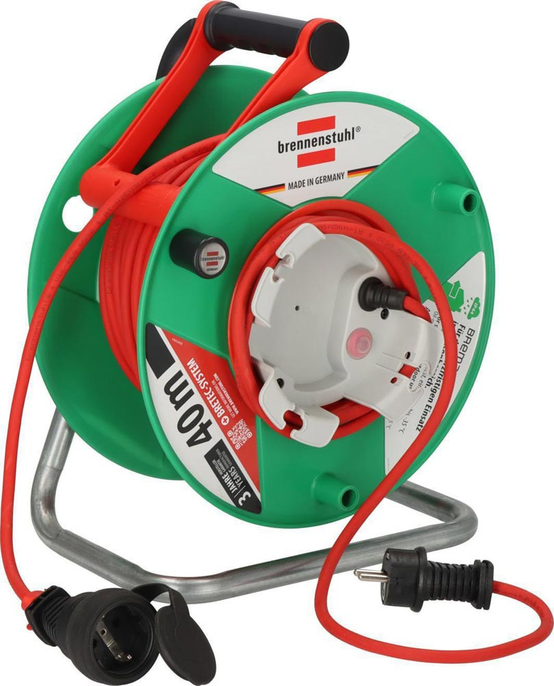 aus Spezialkunststoff auf verzinktem Tragegestell mit zusätzlichem Überhitzungsschutz und Kontroll-Leuchte bei Überhitzung und Überlastung · Trommel-Ø 290 mm · für Rasenmäher mit cleverem Pendelgriff "CABLEPILOT", für freie Hände beim Transport, praktischen Aufhängen und schnellen Ab- und Aufrollen · Verlängerungskabeltrommel mit Stecker und Kupplung mit innovativer Brennenstuhl® Bretec®-Drehkontakt-Technik: Der Trommelkörper läuft getrennt von der Steckdoseneinheit bzw. vom Netzstecker-Anschluss · · Gummikabel AT-N05V3V3-F 3G1,5 für die kurzzeitige Verwendung im Freien