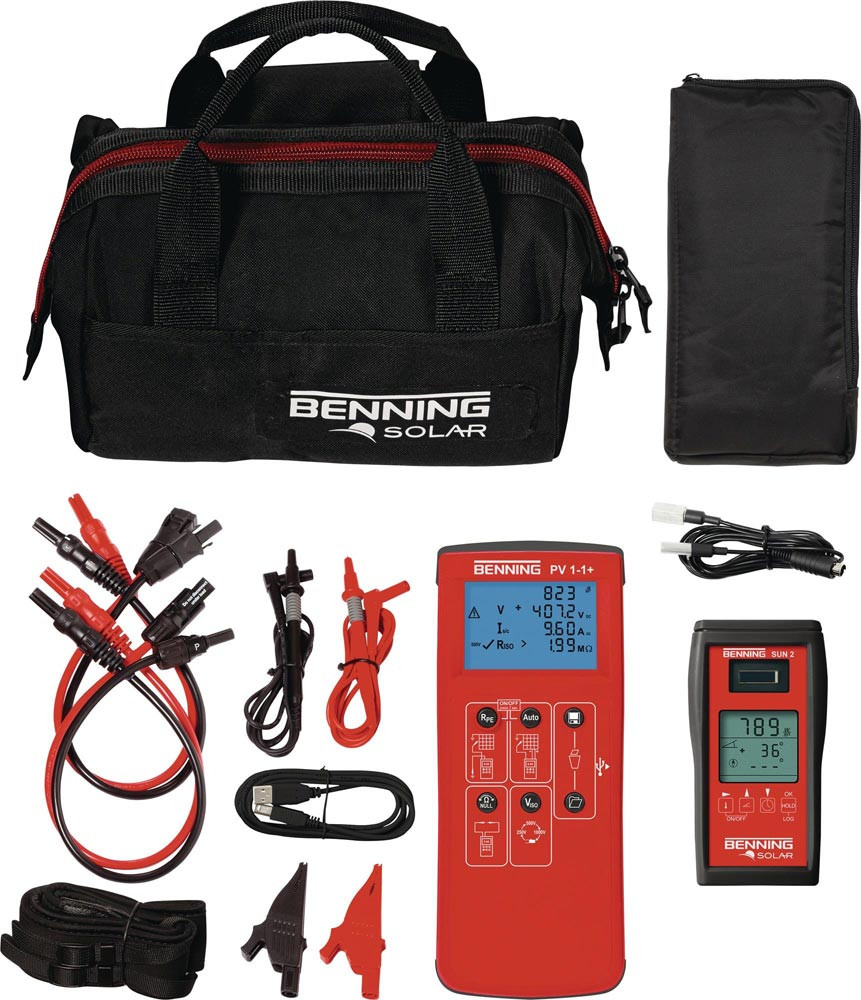 BENNING PV 1-1+ inkl. Trageriemen, Messleitungen, Krokodilklemmen, MC4-/ Sunclix-Messleitungen, Tasche, 6 x 1.5 V Mignon AA LR6 Batterien, Solar Datalogger über Downloadlink, Sicherung 0,5 A