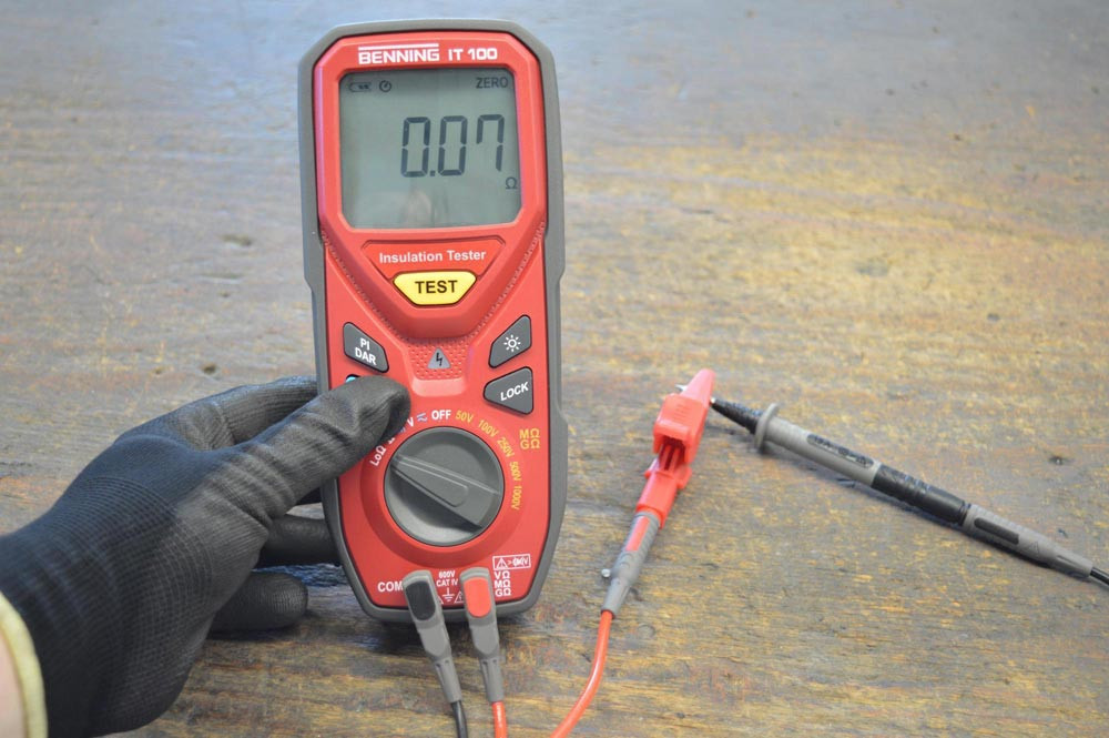 Isolations- und Widerstandsmessgerät für Niederohm- (60 Ω), Isolationswiderstands- (20 GΩ, Prüfspannung 50 V - 1000 V), Widerstands- (200 mA Prüfstrom), Spannungsmessung, Polarisationsindex (PI), dielektrischer Absorptionsgrad (DAR), mit roter LED für Prüf-/ Fremdspannung, automatische Entladung, Nullabgleich, Lock, CAT IV 600 V.