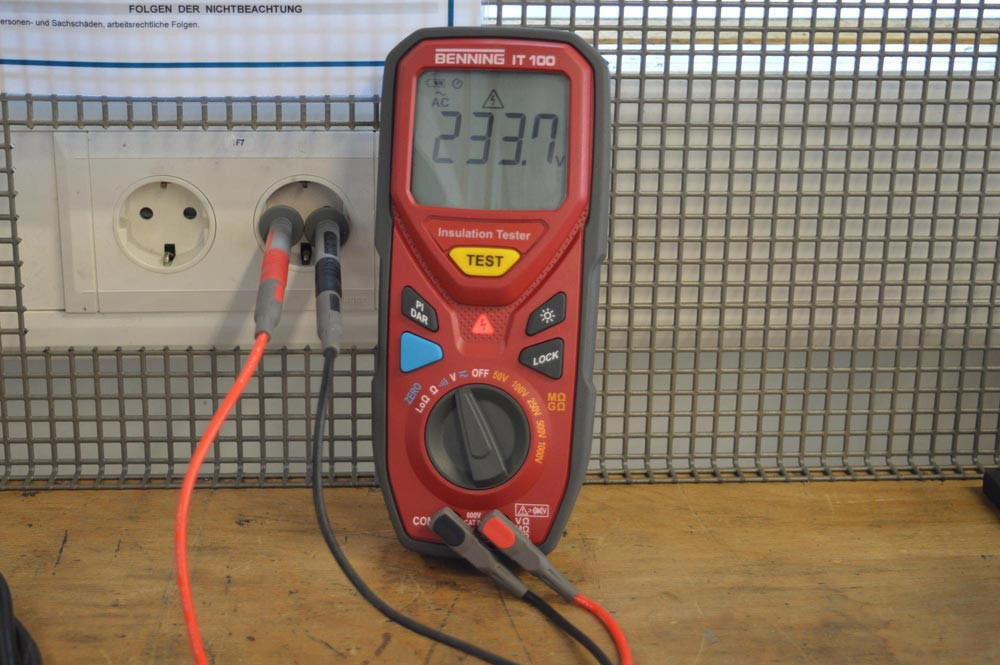 Leerlaufspannung (Uo/c) bis 1500 V DC über 4 mm Sicherheitsbuchsen (PV-Kurzschlussschalter, BENNING CM 3-PV), Kurzschlussstrom (Is/c) bis 23 A DC (bei 1500 V) sicher schalten, messbar über Kurzschlussbrücke (MC4 kompatibel) und Strommesszange, Isolationswiderstand (Riso) über 4 mm Sicherheitsstecker (PV-Kurzschlussschalter, BENNING IT 100), Isolationswiderstand bei Kurzschluss und im Leerlauf des PV-Strangs messbar