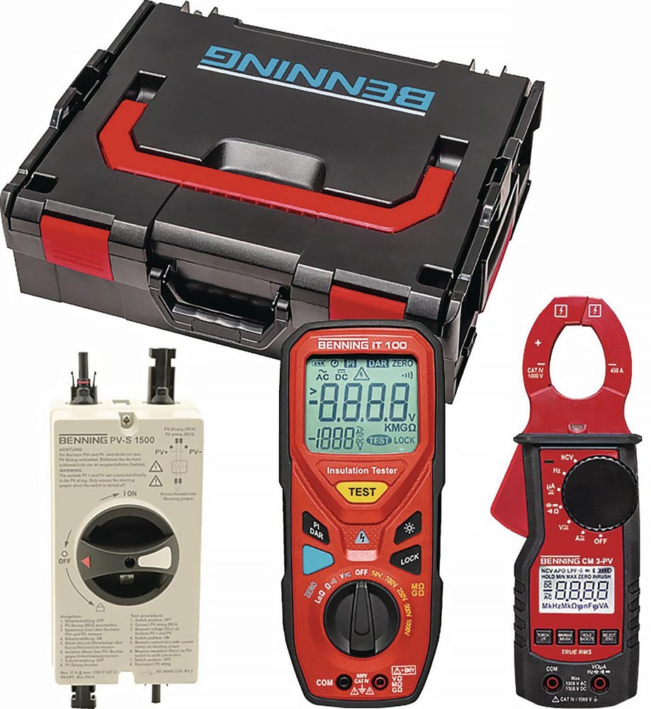 Lieferumfang: BENNING PV-S 1500 inkl. PV-Kurzschlussschalter, Kurzschlussbrücke MC4 kompatibel, BENNING IT 100 inkl. Tasche, Messleitungen, Krokodilklemmen, Gummischutzrahmen, 4 x 1.5 V Mignon/ AA/ LR6 Batterie, Sicherung 0.315 A, BENNING CM 3-PV inkl. Tasche, Messleitungen, 2 x 1,5 V Micro/ AAA/ LR03 Batterien, robuste BENNING L-BOXX 136 mit passendem und vorkonfektioniertem Rasterschaumstoff aus dem Sortimo- System