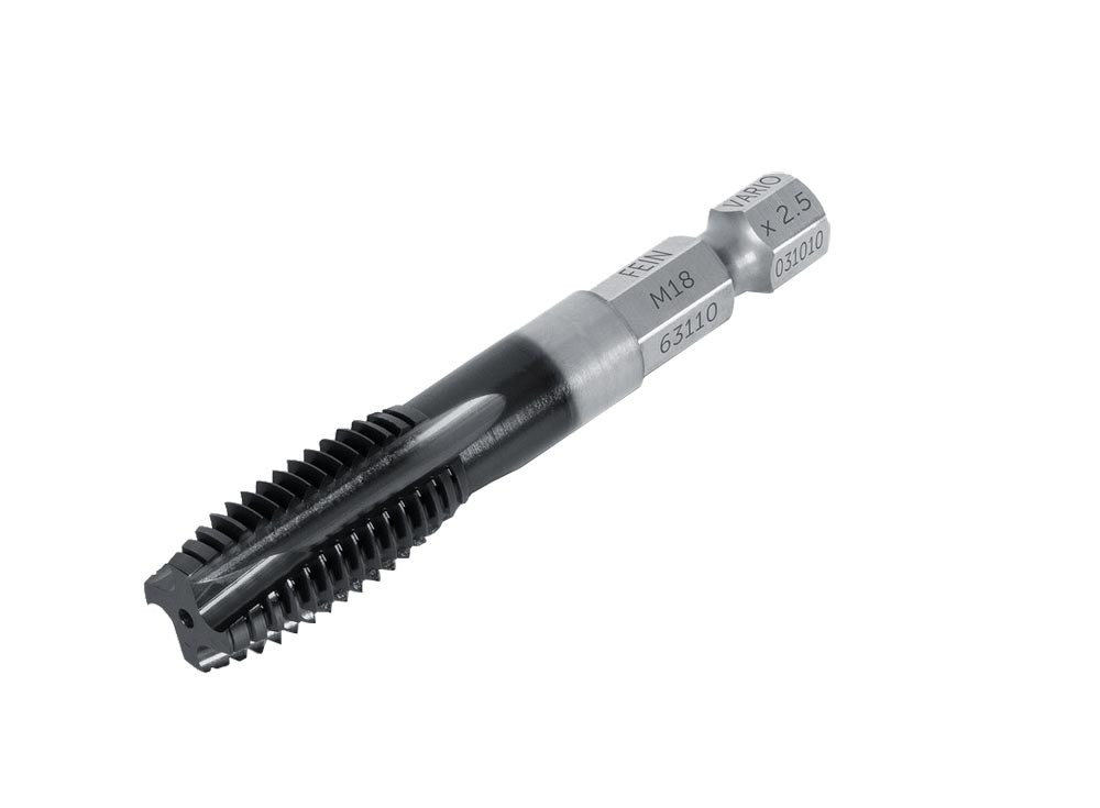 FEIN Vario Gewindebohrer in 11 verschiedenen Größen für Durchgangslöcher. Einzeln oder im Set (M8 - M16) erhältlich. Aus robustem HSS Material mit TiAlN Beschichtung (Titan-AluminiumNitrit). Speziell für die Arbeit mit handgeführten Schlagschraubern. Hitzebeständig bis 800 °C und reibungsärmer dank exklusiver TiAlN Beschichtung.