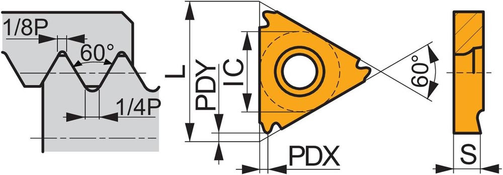 Einseitige Gewindedreh-Wendeschneidplatte · dreieckig mit einem Innenkreisdurchmesser von 9.525mm · für rechtsschneidende Werkzeuge für UN-Innengewinde mit 11TPI · T8030 PVD beschichtet feinkörniges WC-Co-Hartmetall innerhalb der ISO-Substrats-Bereiche P25-P40/M20-M35 und K20-K40 zum zerspanen von Stahl · Edelstahl und Guss