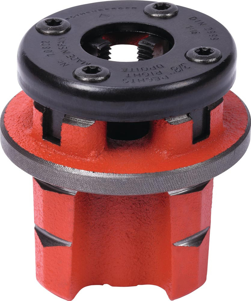Gewindeschneidköpfe zum Herstellen von präzisen und normgerechten Gewindeverbindungen nach EN 10226 · DURA EASY CUT - Gewindeschneidköpfe mit optimierten Geometrien reduzieren den Kraft-Aufwand um bis zu 10% für Mensch und Maschine · Schnellwechsel-Gewindeschneidköpfe mit sicherem Halt für alle SUPER CUT und SUPERTRONIC 1250, 2000 Modelle · austauschbare Gewindeschneidbacken für höhere Wirtschaftlichkeit · präzisere Fertigungstoleranzen für schnelleren Erfolg