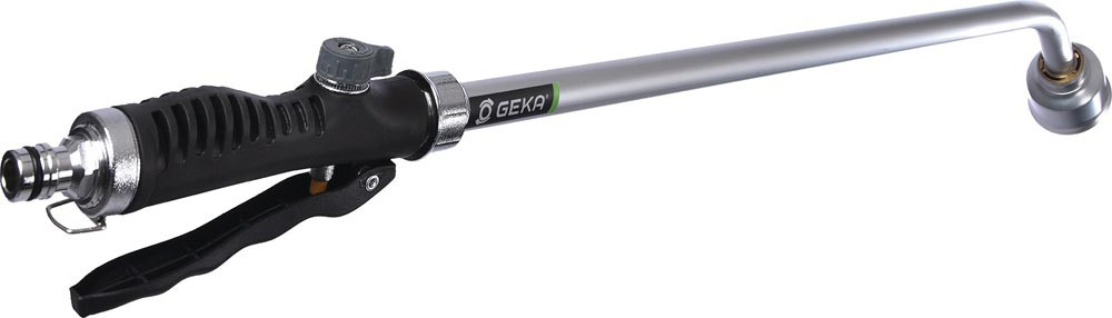 mit Hebelventil · ermöglicht Impulsgießen oder mit betätigter Arretierung eine durchgehende sanfte Bewässerung von Pflanzen · Schutz der Hand vor kaltem Wasserfluss · stufenlose Einstellung der Wassermenge durch Wassermengenregulierung · eingelegter Schmutzfilter verhindert Ablagerungen · Bajonett-Anschluss für bequemen Gießkopfwechsel per Klick, kompatibel mit allen GEKA plus Gießköpfen mit Bajonett-Anschluss · Metallkorpus · Gerätestecker aus verchromtem Messing · Gießkopf der Größe M