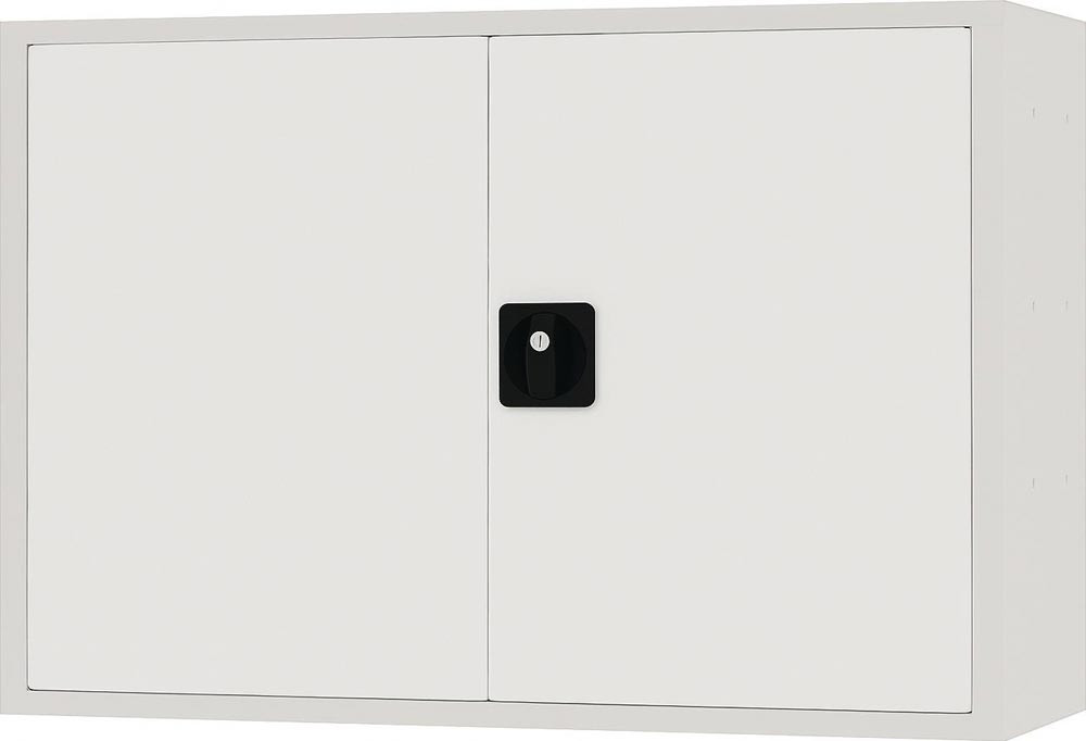 mit zwei Flügeltüren· Flügeltür innenliegend, bündig mit Gehäuse · Türöffnungswinkel ca. 100° · Fachboden aus verzinktem Stahlblech · Griffschalenschloss inkl. 2 x Schlüssel · Verriegelung seitlich · Blechstärke 1 mm · Tragfähigkeit 35 kg · zur Wandbefestigung