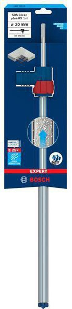 Bohren in Stahlbeton mit verbesserter Staubreduzierung! Durchdringt Stahlbeton mit einem Voll-Carbide-Kopf mit 4 Schneidern Das Bohren präziser Löcher in Beton ist nur ein Schritt bei der Installation chemischer Dübel. Der nächste Schritt besteht in zeitraubenden Reinigungsarbeiten. Mit dem EXPERT SDS Clean plus-8X wird alles anders. Das System bohrt Löcher und entfernt gleichzeitig Staub. Das beschleunigt und vereinfacht die Installation chemischer Dübel. Wir haben das EXPERT SDS Clean plus-8X Set für Bauarbeiter und Installateure entwickelt · die Löcher für chemische Dübel bohren müssen. Der Bohrer ist mit einem 4-Schneider-Vollhartmetallkopf und einem robusten Staubsaugerrohr ausgestattet. Zudem haben wir den SDS Clean plus Anschluss verbaut · der für alle SDS Clean plus-8X Bohrer geeignet ist und sich leicht montieren und abnehmen lässt. Du erhältst also einen leistungsstarken Bohrer · der bei Verstopfung leicht zu reinigen ist (einfach das Absaugrohr vom Bohrer abnehmen) sowie eine neue Technologie zur Staubreduzierung · mit der du Löcher für chemische Dübel schneller vorbereiten kannst. Zudem ist die Luft am Arbeitsplatz sauberer. Alles mit nur einem Zubehör. Hocheffizienter Abtransport von Staub mit Bosch Particle Control