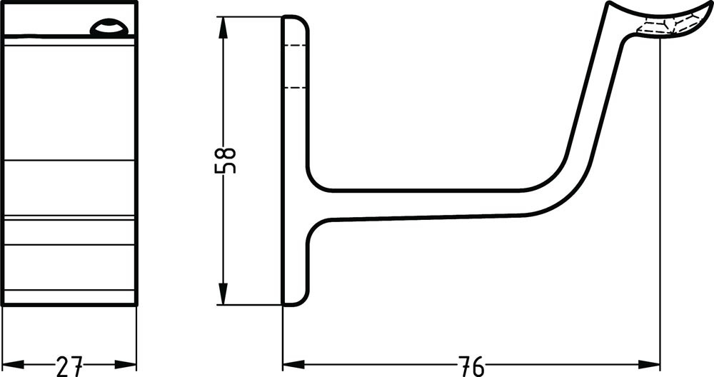 nach DIN 18040 · gewölbte Auflage · Aluminiumprofil · Wandabstand 76 mm · Wandplatte Höhe 58 mm Breite 27 mm · mit sichtbahrer Bohrung für Schraube M8 · TÜV-zertifiziert · ohne Befestigungsmaterial