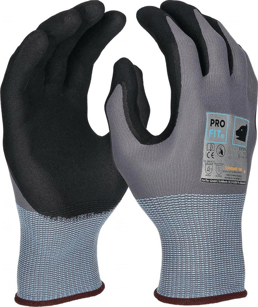 nach EN 388, EN 407 · Kat.II · Material: Polyamid (Nylon), Elasthan® · grau/schwarz · Handinnenfläche und Fingerkuppen mit geschäumter Mikro-Nitril Beschichtung · Feinstrick, nahtlos · Strickbund · herausragender Tragekomfort durch die neue ERGO-FIT Passform · besonders atmungsaktiv · flexibel · sicherer Griff in trockener, öliger, fettiger und leicht feuchter Umgebung · hervorragendes Tastgefühl · gute Abriebfestigkeit für lange Standzeiten · nach OEKO-TEX-Standard® 100 zertifiziert · Touchscreen fähig