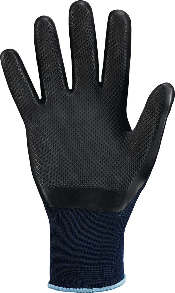 nach EN 388, EN 407 · Kat. II · Träger: 100% Polyester, dunkelblau · Beschichtung: Latex, schwarz · Feinstrick, nahtlos / 13 G · Kontakthitzefestigkeit 2 · Beschichtung: Latex mit Waffelmuster · flexibler Liner für eine perfekte, ergonomische Passform und sehr hohen Tragekomfort · sehr gute Griffsicherheit im Trocken- sowie Nassbereich