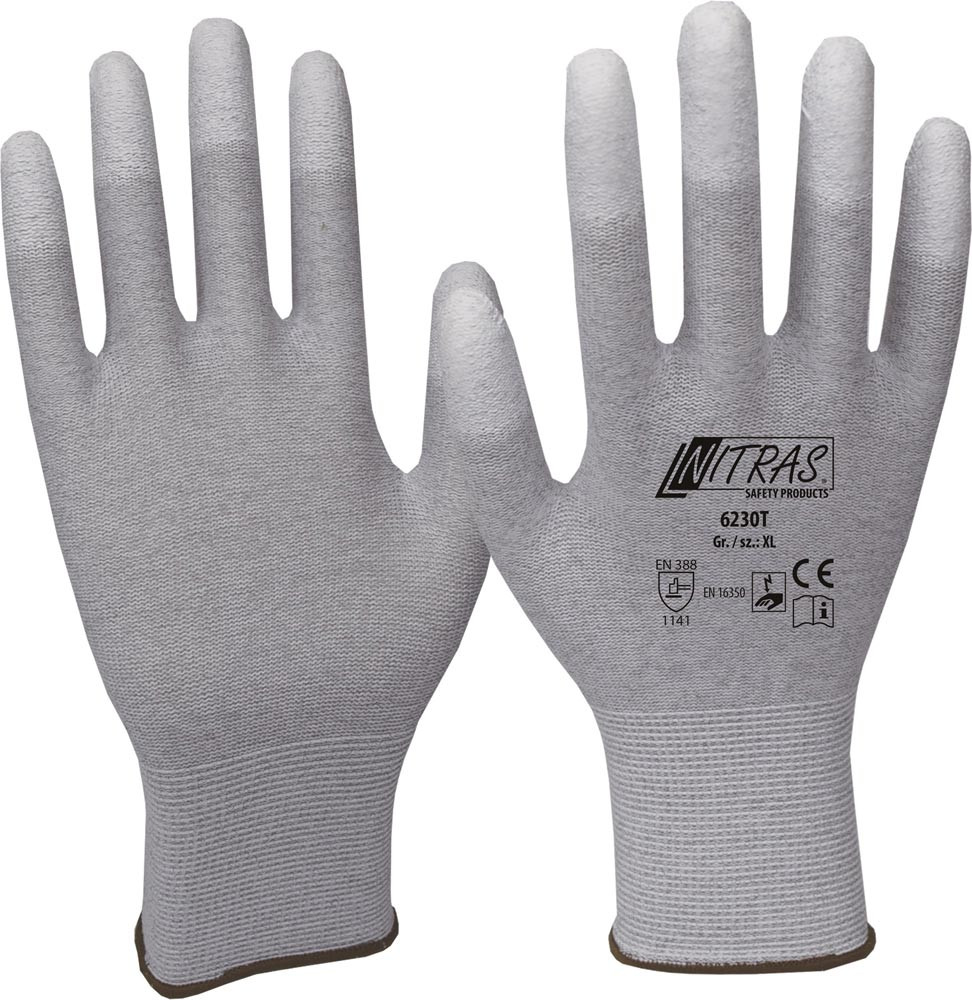 nach EN 388 · EN 16350 · Kat.II · Material: Nylon-Carbon-Strick · grau · weiße PU-Beschichtung auf den Fingerkuppen · mit Strickbund · eingearbeiteter Carbonfaden · gute Fingerfertigkeit · touchscreenfähig · farbliche Größenkennung · Anwendung: präzise Tätigkeiten, Reinraum, Elektroindustrie, brennbare und explosionsfähige Atmosphären, schützt vor Schäden durch elektrostatische Entladungen