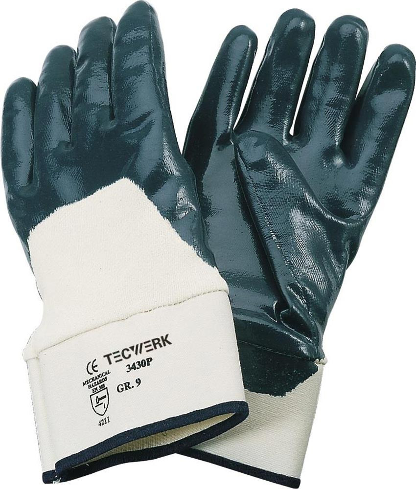 nach EN 388 · EN 420 · Kat. II · Material: widerstandsfähige, hochwertige Nitrilbeschichtung · robust beim Umgang mit scharfkantigen Materialien · flüssigkeitsabweisend · stößt Fett und Öl wirksam ab · mit Sicherheitsstulpe · hohe Abriebfestigkeit · gummierte Stulpe · Trägermaterial 100% Baumwolle · Anwendung: