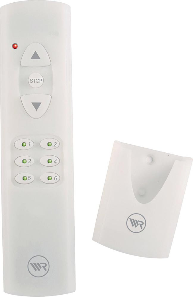 rot / grüne Status-LED zur visuellen Quittierung des korrekten Empfangs der Befehle · nachträgliche Einstellung der Endpunkte sowie Drehrichtungsumkehr von Funk-Rohrmotoren: manuelle Bedienung von bis zu 48 DuoFern-Empfängern in 6 Gruppen · 6 beleuchtete Tasten (mit Einzelgeräten oder mehren Geräten als Gruppensteuerung belegbar)