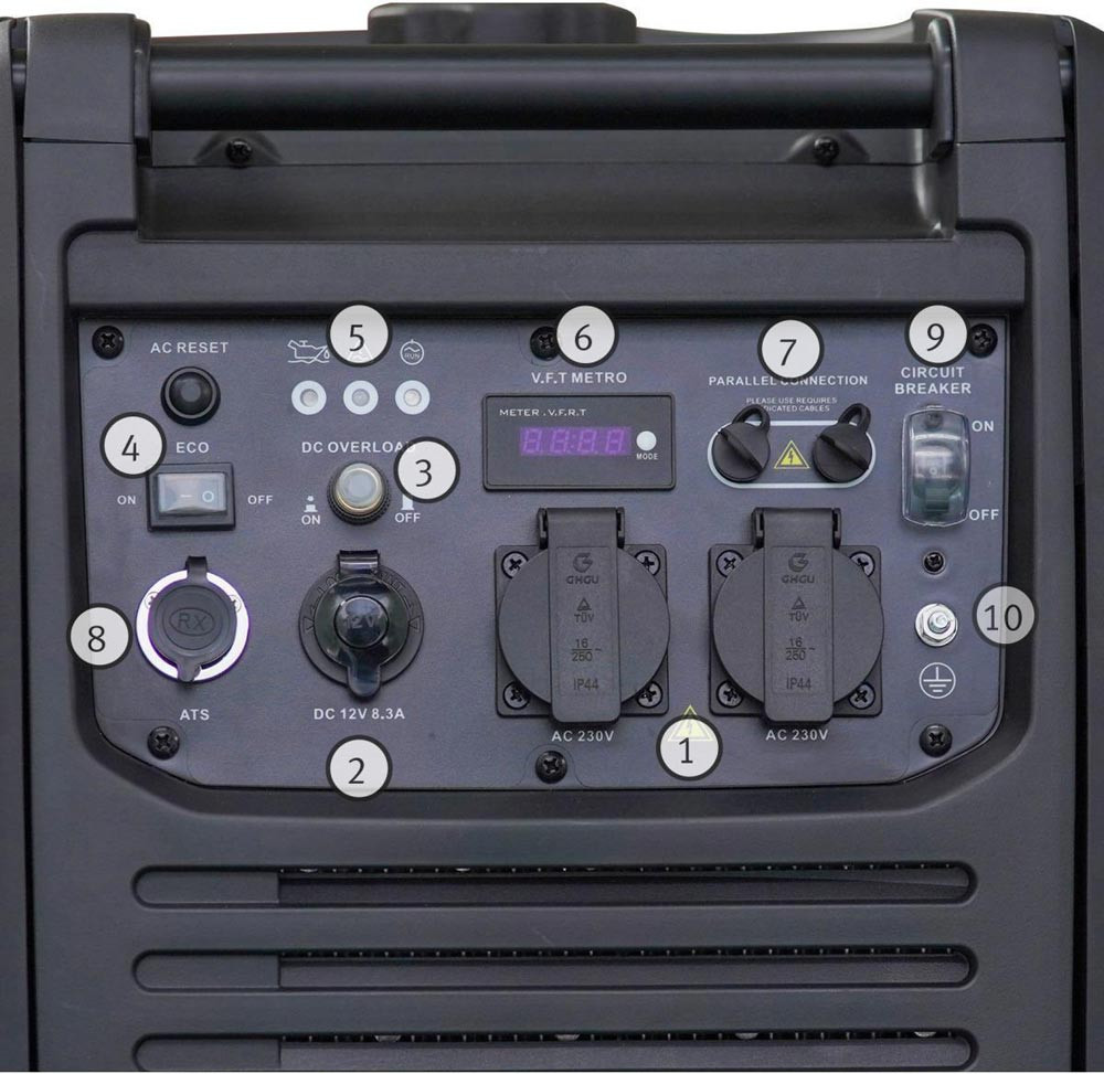 liefert Strom mit reiner Sinuswelle für Geräte mit empfindlicher Elektronik, wie z. B. PC`s · konstante Leistungsabgabe · geräuscharm · leistungsabhängige, stufenlose Drehzahlregulierung · ECO-Modus · Elektrostart: Starten auf Knopfdruck · Kontrollleuchten für Ausgangsspannung, Überlastung und Ölmangel · Choke · Fahrwerk und Transportgriff · geeignet für die Hauseinspeisung mit manuellem Netztrennschalter