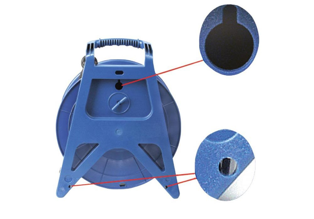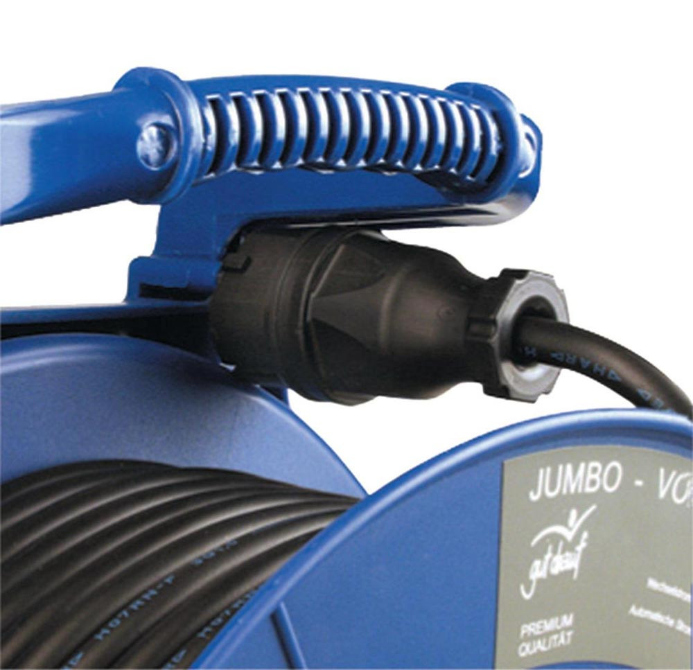 aus Vollkunststoff · mit 4 spritzwassergeschützten, sicherheitsgeprüften Schutzkontakt-Steckdosen mit selbstschließenden Klappdeckeln · 230 V AC · 16 A · für den härtesten Baustelleneinsatz · integrierter Thermoschutzschalter mit Wiederanlaufschutz · mit Schutzkontakt-Vollgummistecker · Trommelkörper blau · Gummikabel H07RN-F